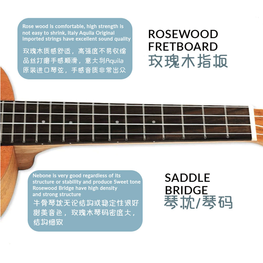 A fullbodied tone with plenty of Sweet Highs and Mellow Lows that combine for a full rich sound.A satin finish gives the Ukulele an antique, wellplayed in feel.You will appreciate the low action and the ease of playability.