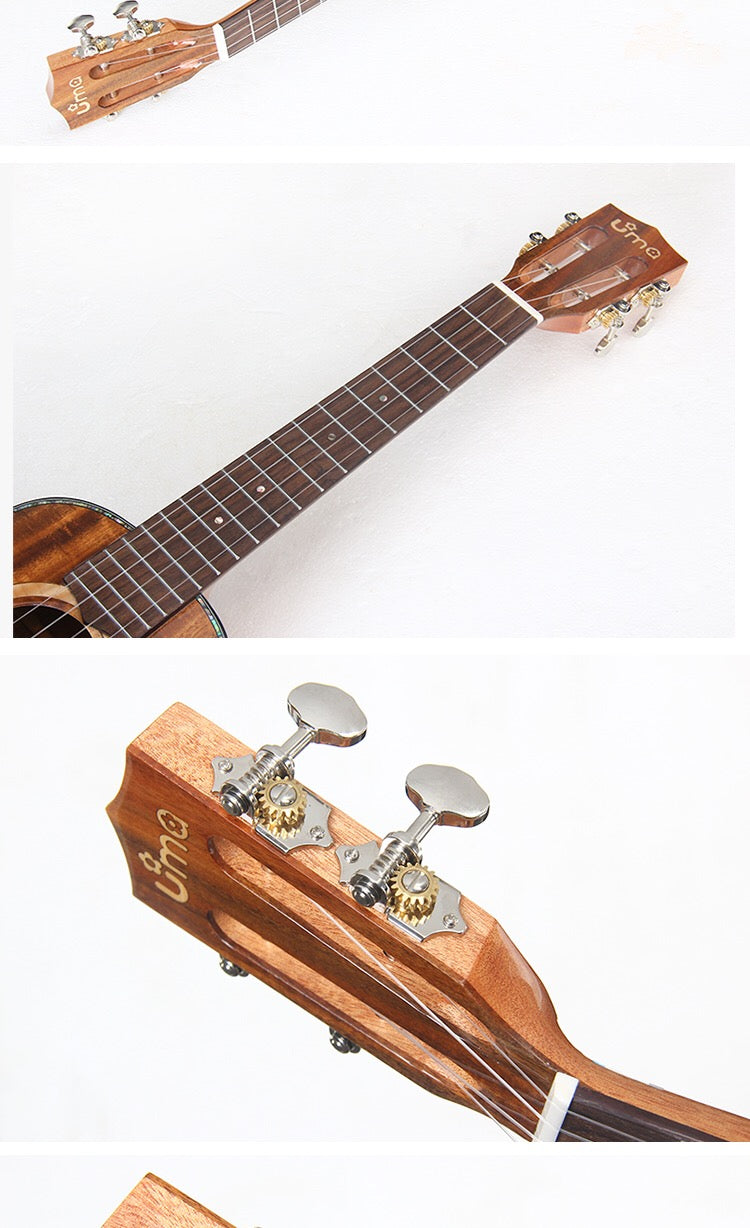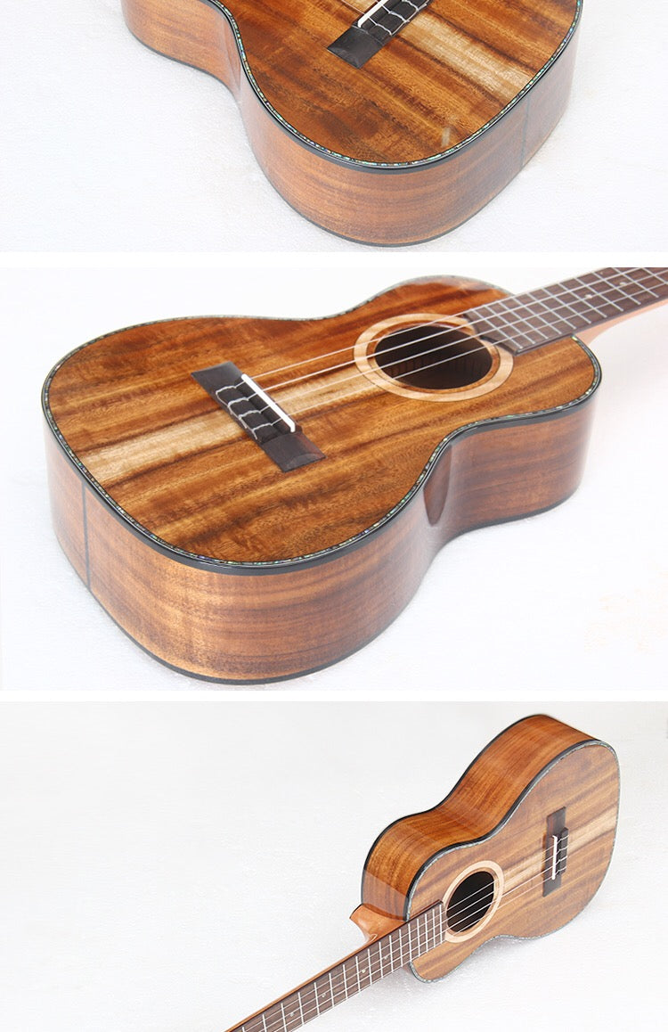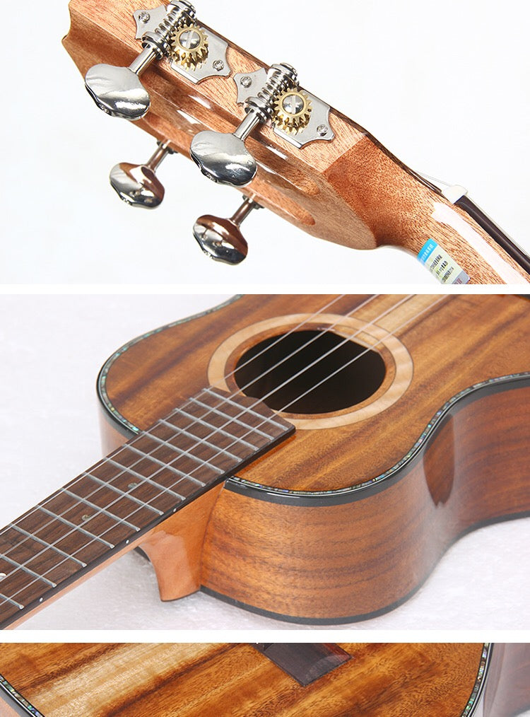 A solid koa top, which is a medium hardness, to produce a warmer sound and sparkling treble end. Koa body make the ukulele more durable.